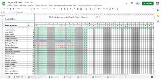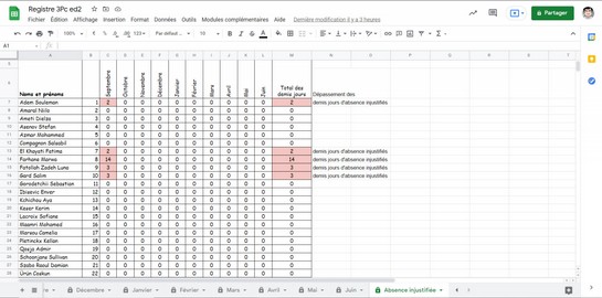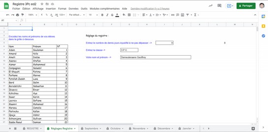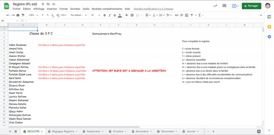 Je vous propose cet outil qui va vous aider dans le calcul de votre registre et vous signalera les élèves qui dépassent les 9 demi-jours d'absence injustifiée. C'est un petit tableur fonctionnant sous Sheet (dans Google Workspace)